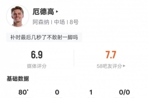 下一篇: 赖斯本场2射进2球 3解围3抢断+8对抗4成功 获评9.2分全场最高