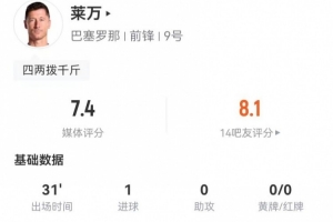 莱万本场替补数据:1射进1球 3对抗1成功+1造犯规 获评7.4分