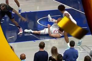 这才刚开场64秒啊!申京落地时踩脚受伤表情痛苦 已回更衣室