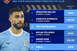 体育资讯1月5日讯 在菲尔克鲁格离队后,西汉姆联迅速签下了巴勃罗·费利佩和瓦伦丁·卡斯特拉诺斯,数据统计显示他们也位列铁锤帮队史最贵前锋榜前六。