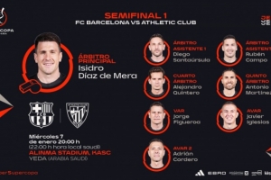体育资讯1月6日讯 西班牙足协公布了西超杯的裁判安排,德·梅拉执法巴萨vs毕巴,马特奥·布斯克茨执法皇马vs马竞。