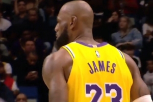 詹姆斯顶着锡安中投打篮板上沿24秒 随后向裁判抱怨被侵犯圆柱体