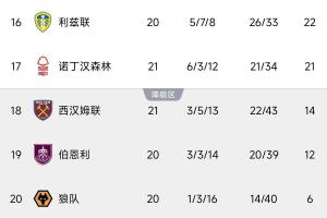 倒数第1的狼队,基本锁定一个降级名额。他们曾遭遇12连败和19轮不胜,直到上一轮才3-0击败西汉姆联取得首胜。