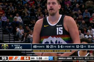 约基奇三节狂砍52分11篮板6助攻 本赛季联盟第5个50+!