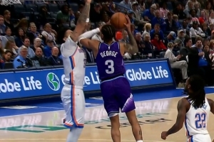 挑战成功!乔治突破飞身放篮打成2+1 雷霆挑战成功改判进攻犯规