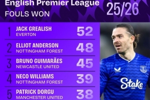体育资讯1月10日讯 数据机构squawka统计了本赛季英超的造犯规情况,格拉利什居首。