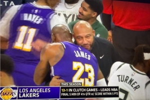 赛后,詹姆斯和现雄鹿助教、前湖人主教练哈姆拥抱致意。