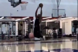 据快船随队记者Law Murray报道,克里斯·保罗在洛杉矶Playa Vista的老快船训练基地练习扣篮。