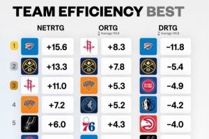 各队净效率&攻防效率排名!净效率&防守效率雷霆第1 进攻火箭第1