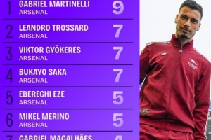 本赛季阿森纳队内各项赛事进球榜:马丁内利9球居首,萨卡7球次席