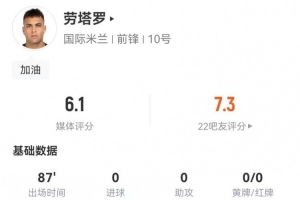 劳塔罗本场1射0正+15丢失球权 3过人3成功+16对抗5成功 获评6.1分
