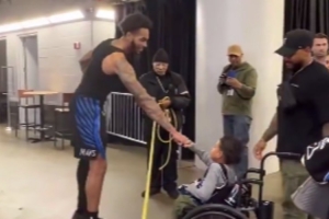赛后,独行侠前锋PJ·华盛顿在球员通道处给自己的球衣签名,并将其送给了一位残疾的小球迷,随后与之碰拳。