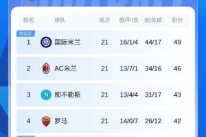 四强争霸!意甲积分:米兰距榜首3分+20轮不败 罗马3连胜紧追前3