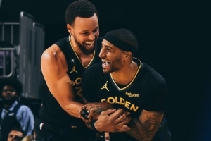赛后,勇士官方发布赢球海报,库里和小佩顿大笑庆祝瞬间成为封面。