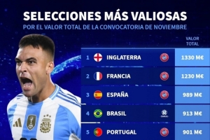 体育资讯11月15日讯 德国转会市场统计了11月国际比赛日各国家队的身价,并列出榜单,英格兰、法国、西班牙前三,阿根廷排在第九位。