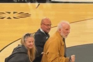 波波维奇现身昨日奥斯汀马刺比赛现场 走路需持拐杖&要人搀扶