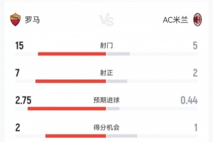罗马1-1米兰数据:射门15-5,射正7-2,预期进球2.75-0.44