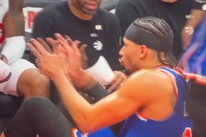 装大了!哈特投进三分后对着猛龙替补席突突突 被毛巾砸脸💀