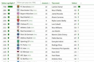 CIES青训球员身价榜:巴萨22人7.38亿欧居首,曼城16人2.86亿第二
