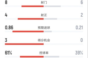 利物浦半场2-1纽卡数据:射门8-6,射正4-2,控球率61%-39%