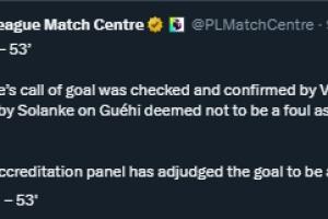 裁判的进球判罚经过VAR检查和确认,索兰克对格伊的接触不构成犯规,因为前者碰到了球。进球认证小组已经判定该进球是索兰克的进球。