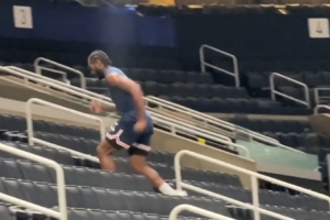 记者Noa Dalzell在赛前两个多小时拍到了在球馆内跑台阶训练热身的莱昂纳德。