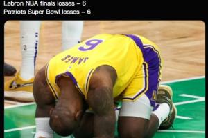 美媒发推写道:“詹姆斯总决赛失利次数6次,爱国者超级碗失利次数6次。”