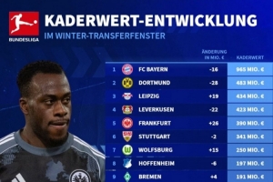 德甲球队冬窗之后身价排名: