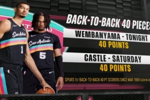 上一场战胜独行侠,卡斯尔砍下40分12篮板12助攻。这是马刺自1984年的格文和迈克·米切尔以来,首次出现连场不同球员砍下40+的情况。